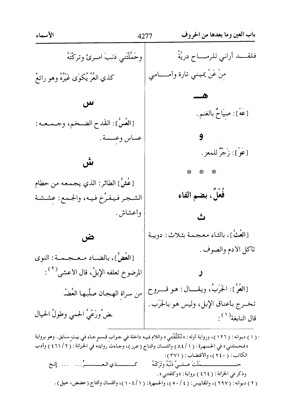 [العُرُّ]: الجَرَبُ، ويقال: هو قروح تخرج بأعناق الإبل، وليس هو بالجَرَب.
