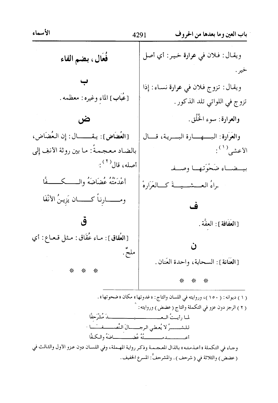 [العُضَاض]: يقال: إن العُضَاض، بالضاد معجمةً: ما بين روثة الأنف إلى أصله، قال «2»: