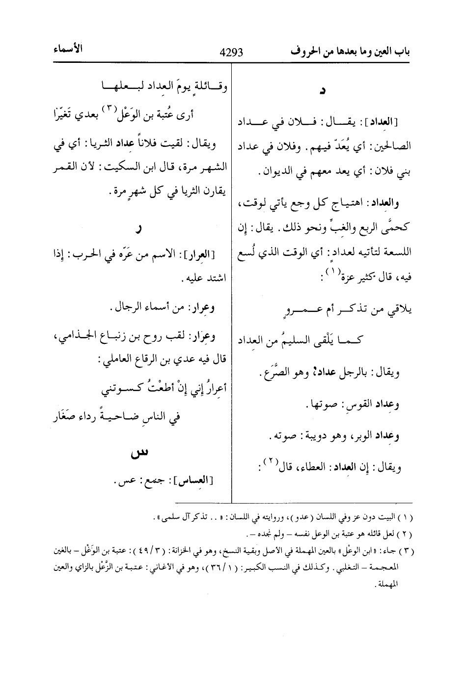 [العِداد]: يقال: فلان في عداد الصالحين: أي يُعَدّ فيهم. وفلان في عداد بني فلان: أي يعد معهم في الديوان.