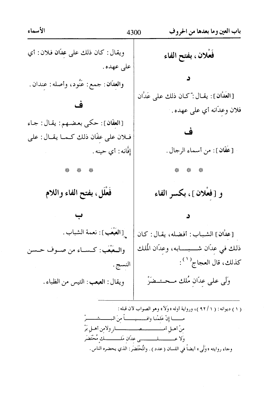 [العَدَّان]: يقال: كان ذلك على عَدَّان فلان وعِدّانه أي على عهده.