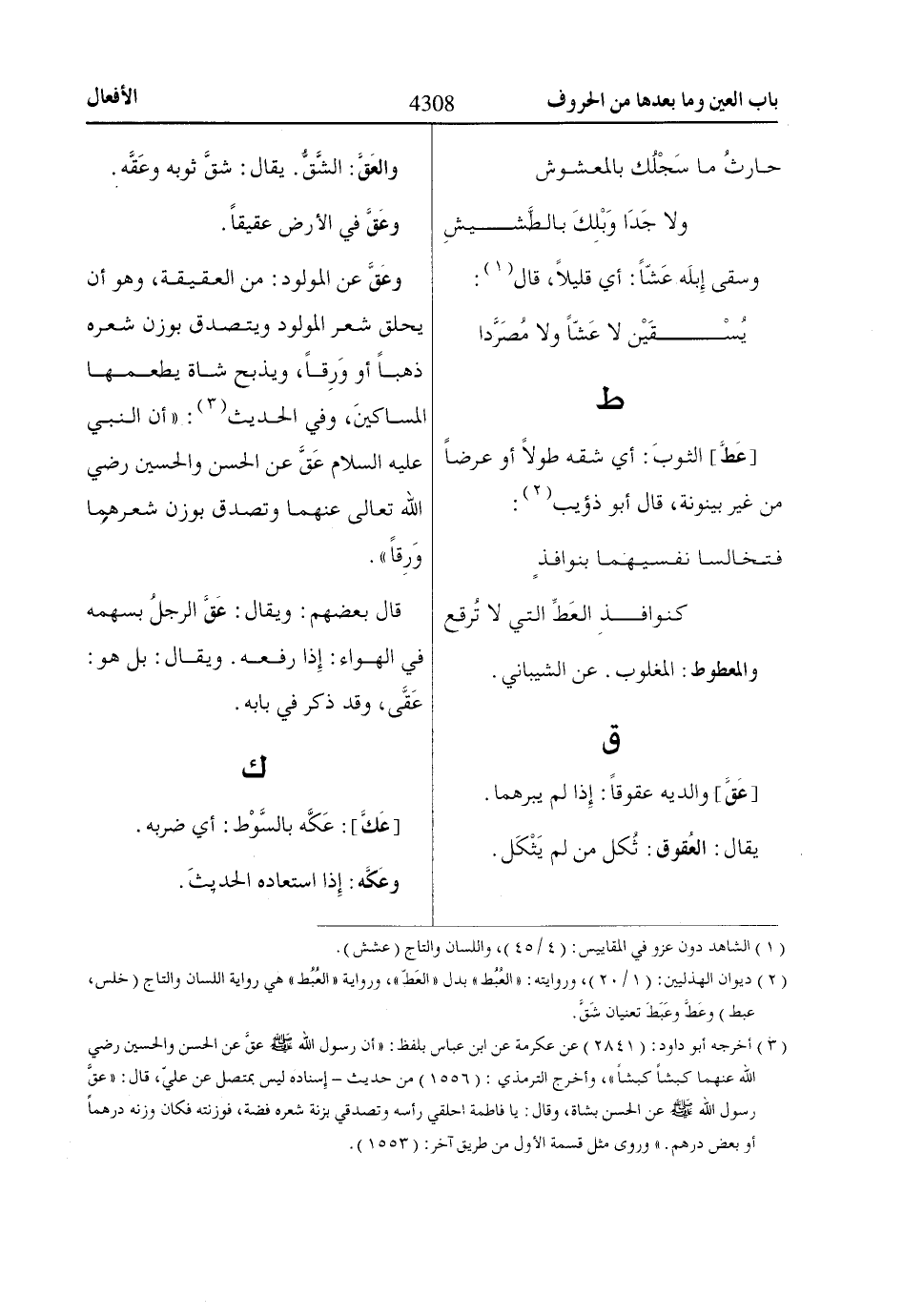 وعَقَّ عن المولود: من العقيقة، وهو أن يحلق شعر المولود ويتصدق بوزن شعره ذهباً أو وَرِقاً، ويذبح شاة يطعمها المساكينَ،