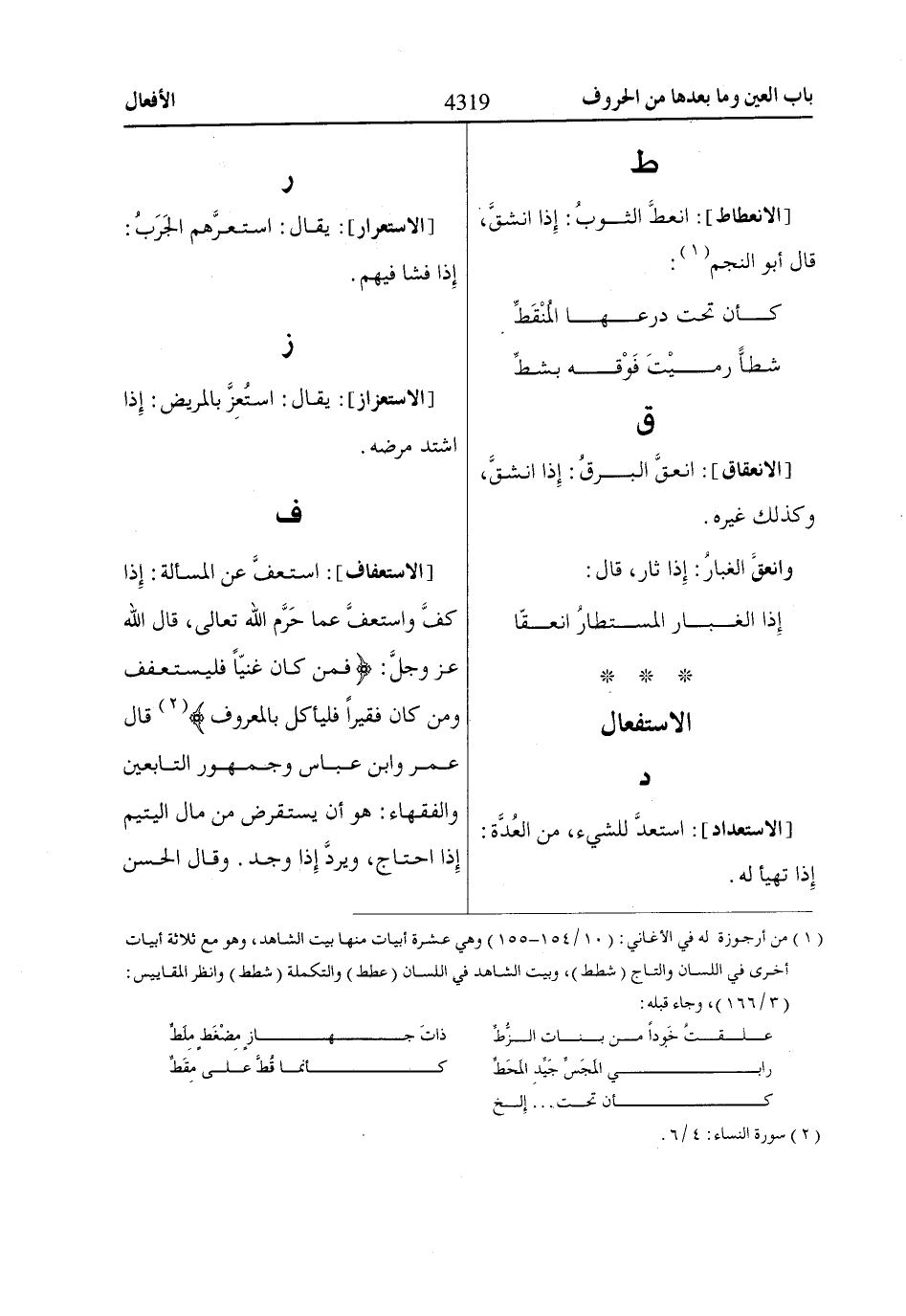 [الاستعفاف]: استعفَّ عن المسألة: إذا كفَّ واستعفَّ عما حَرَّم الله تعالى، قال الله عز وجلَّ: وَمَنْ كاانَ غَنِيًّا فَلْيَسْتَعْفِفْ وَمَنْ كاانَ فَقِيراً فَلْيَأْكُلْ بِالْمَعْرُوفِ «2»