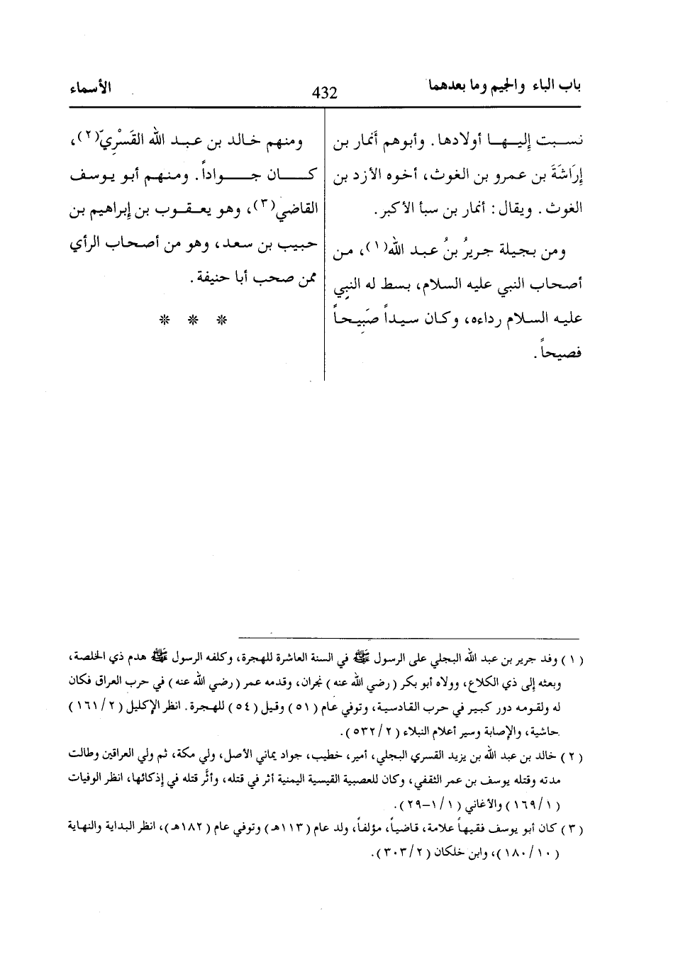 (1) وفد جرير بن عبد اللّاه البجلي على الرسول صَلى الله عَليه وسلم في السنة العاشرة للهجرة، وكلفه الرسول صَلى الله عَليه وسلم هدم ذي الخلصة، وبعثه إِلى ذي الكلاع، وولاه أبو بكر (رضي اللّاه عنه) نجران، وقدمه عمر (رضي اللّاه عنه) في حرب العراق فكان له ولقومه دور كبير في حرب القادسية، وتوفي عام (51) وقيل (54) للهجرة. انظر الإِكليل (2/ 161) حاشية، والإِصابة وسير أعلام النبلاء (2/ 532).