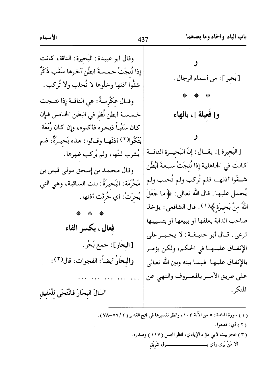 [البَحِيرة]: يقال: إِنّ البَحِيرة الناقة كانت في الجاهلية إِذا نُتِجَتْ سبعةَ أَبْطُن شقّوا أذنها فلم تُركب ولم تُحلب ولم يُحمل عليها. قال اللّاه تعالى: ماا جَعَلَ اللّاهُ مِنْ بَحِيرَةٍ «1». قال الشافعي: يؤخذ صاحب الدابة بعلفها أو ببيعها أو بتسييبها ترعى. قال أبو حنيفة: لا يجبر على الإِنفاق عليها في الحكم، ولكن يؤمر بالإِنفاق عليها فيما بينه وبين اللّاه تعالى على طريق الأَمر بالمعروف والنهي عن المنكر.