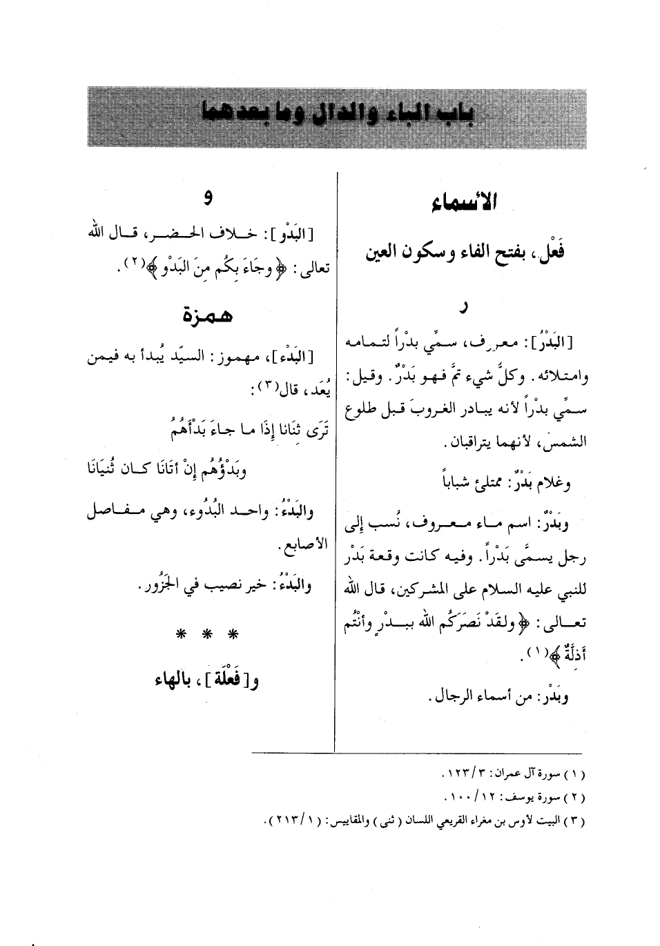 وبَدْرٌ: اسم ماء معروف، نُسب إِلى رجل يسمَّى بَدْراً. وفيه كانت وقعة بَدْر للنبي عليه السلام على المشركين، قال اللّاه تعالى: وَلَقَدْ نَصَرَكُمُ اللّاهُ بِبَدْرٍ وَأَنْتُمْ أَذِلَّةٌ «1».
