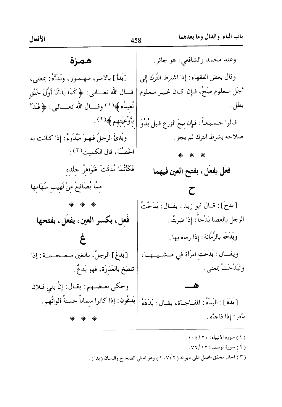 [بَدَأَ] بالأمر، مهموز، وبَدَأَهُ: بمعنى، قال اللّاه تعالى: كَماا بَدَأْناا أَوَّلَ خَلْقٍ نُعِيدُهُ «1» وقال اللّاه تعالى: فَبَدَأَ بِأَوْعِيَتِهِمْ «2».