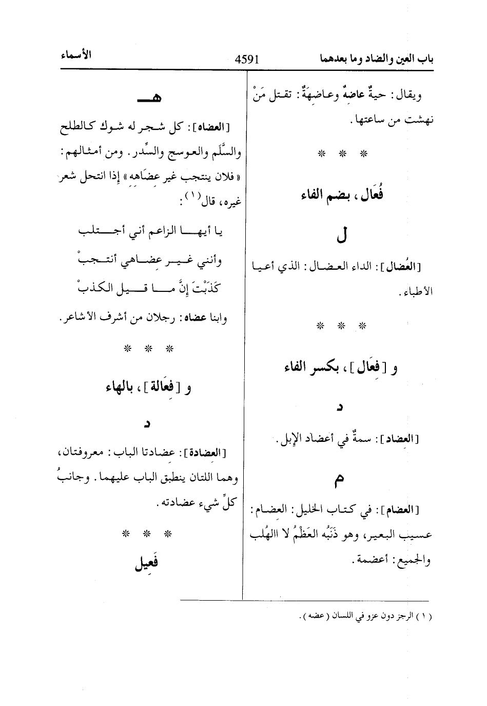 [العضاه]: كل شجر له شوك كالطلح والسَّلَم والعوسج والسِّدر. ومن أمثالهم: