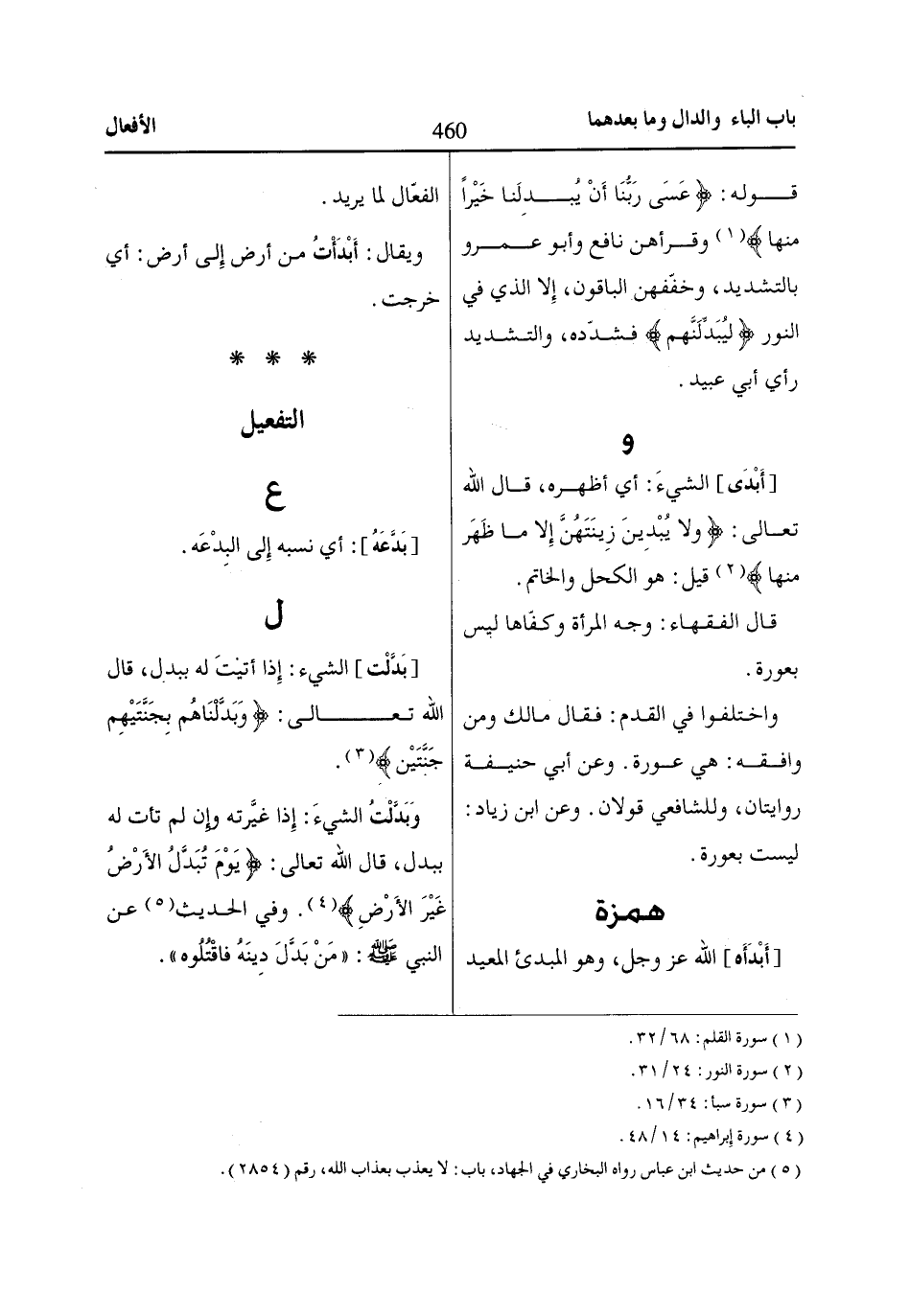 [بَدَّلْت] الشيء: إِذا أتيتَ له ببدل، قال اللّاه تعالى: وَبَدَّلْنااهُمْ بِجَنَّتَيْهِمْ جَنَّتَيْنِ «3».