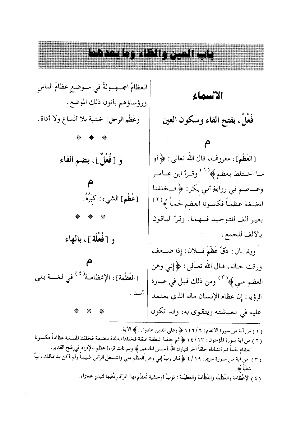 (2) من آية سورة المؤمنون: 23/ 14 ثُمَّ خَلَقْنَا النُّطْفَةَ عَلَقَةً فَخَلَقْنَا الْعَلَقَةَ مُضْغَةً فَخَلَقْنَا الْمُضْغَةَ عِظااماً فَكَسَوْنَا الْعِظاامَ لَحْماً ثُمَّ أَنْشَأْنااهُ خَلْقاً آخَرَ فَتَباارَكَ اللّاهُ أَحْسَنُ الْخاالِقِينَ ولم تأت قراءة عظم بالإفراد في فتح القدير.