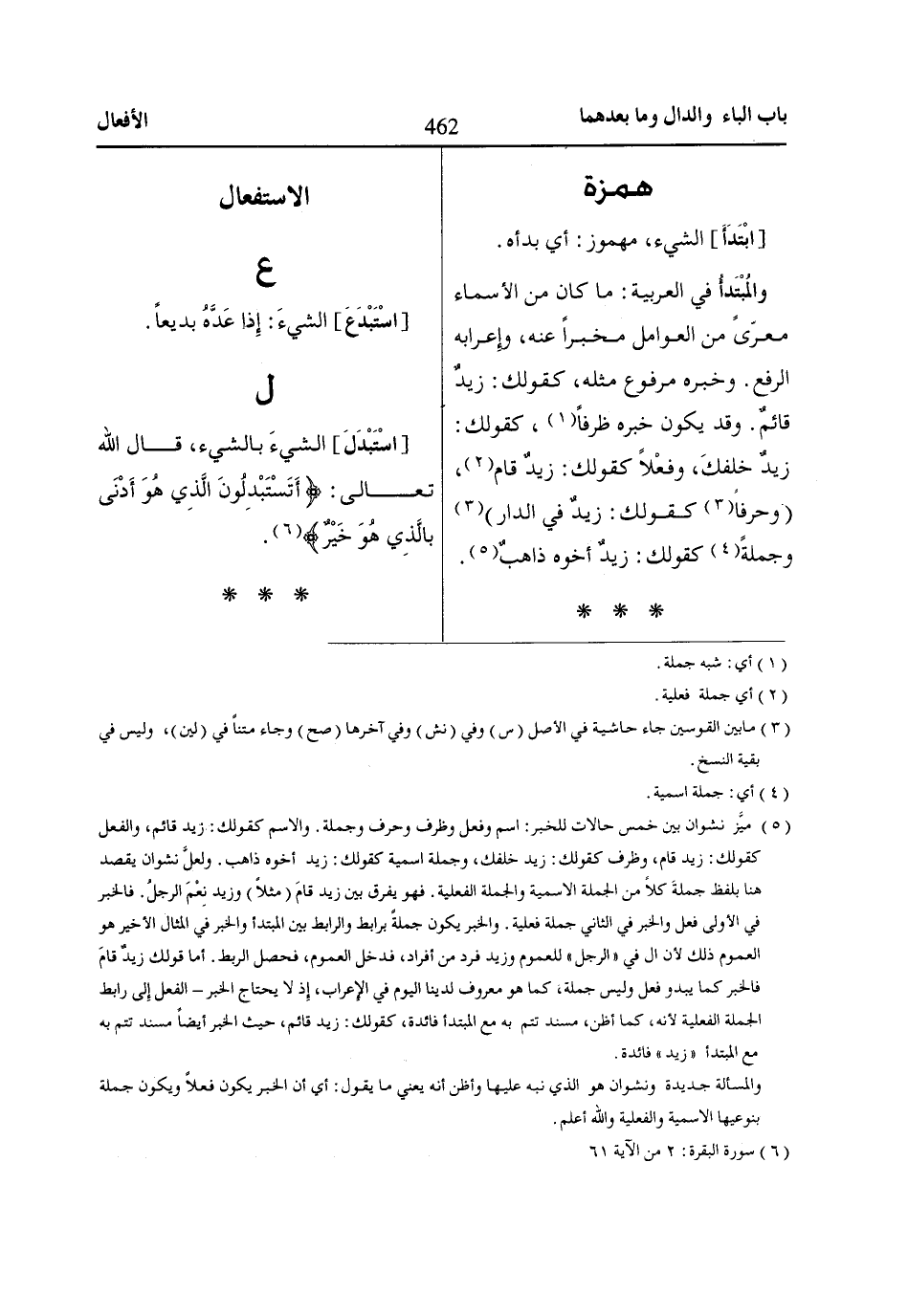 زيدٌ خلفكَ، وفعْلًا كقولك: زيدٌ قام «2»، (وحرفاً «3» كقولك: زيدٌ في الدار) «3» وجملةً «4» كقولك: زيدٌ أخوه ذاهبٌ «5».