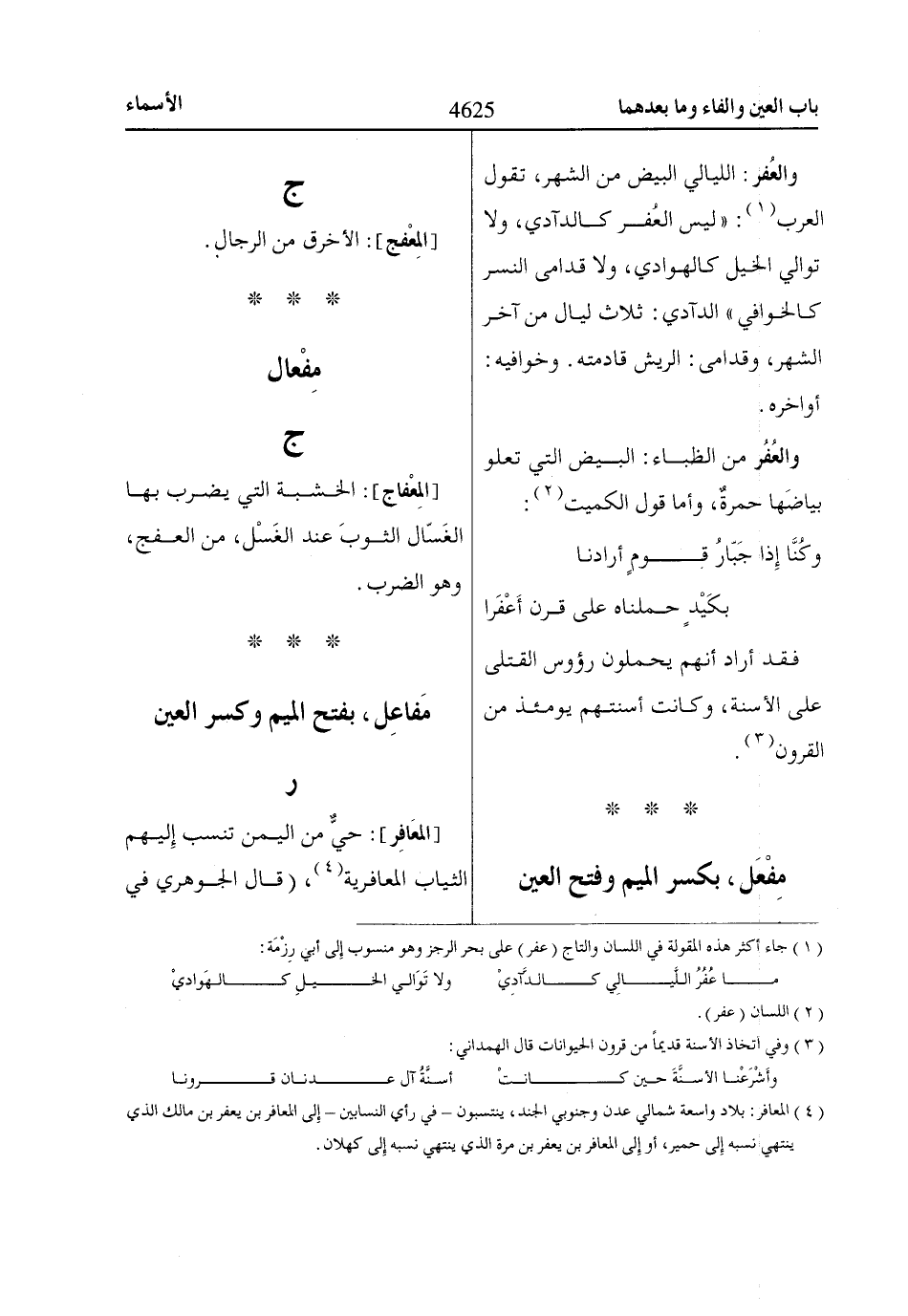 [المعَافِر]: حيٌّ من اليمن تنسب إليهم الثياب المعافرية «4»، (قال الجوهري في