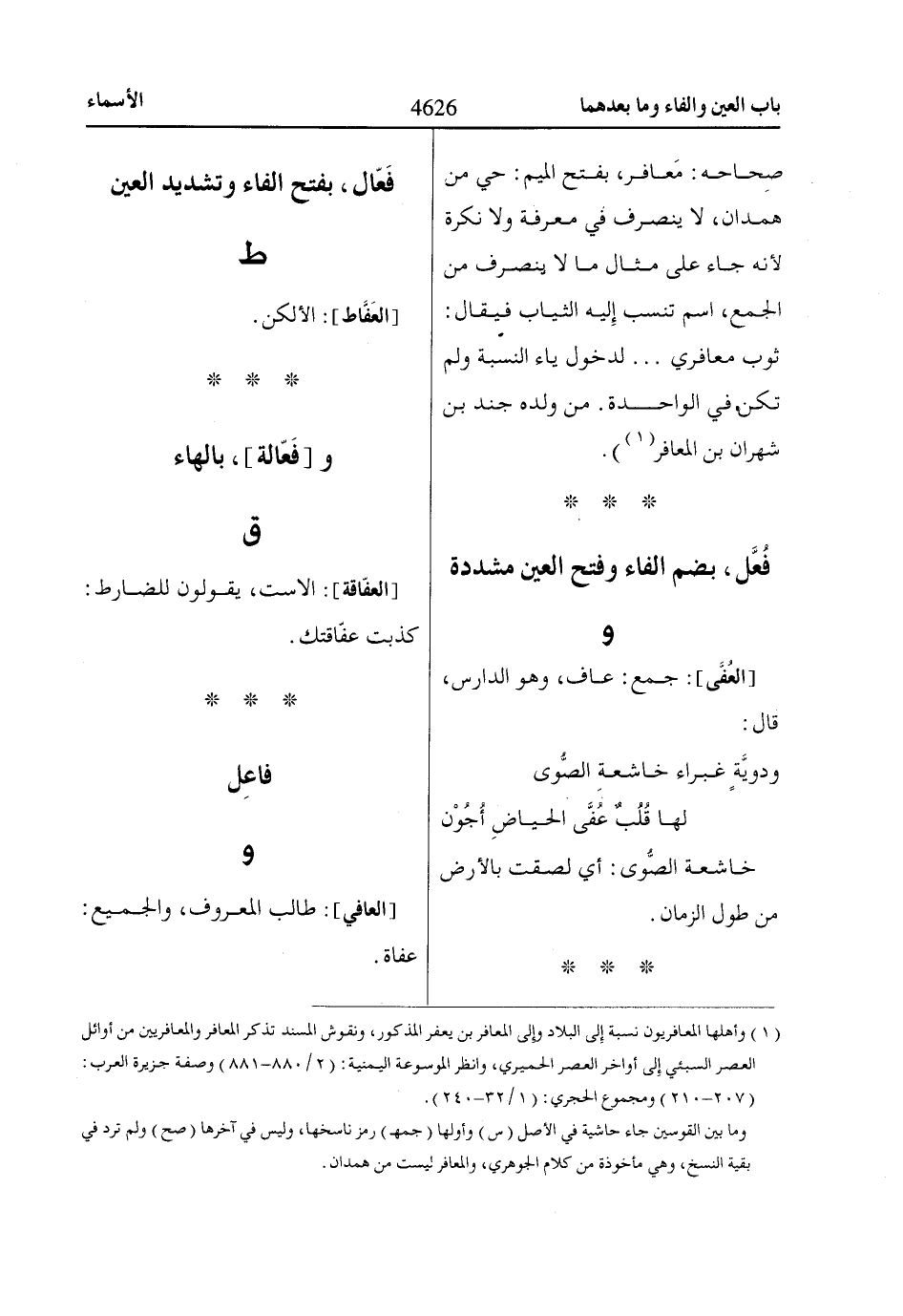 صِحاحه: مَعافر، بفتح الميم: حي من همدان، لا ينصرف في معرفة ولا نكرة لأنه جاء على مثال ما لا ينصرف من الجمع، اسم تنسب إليه الثياب فيقال: