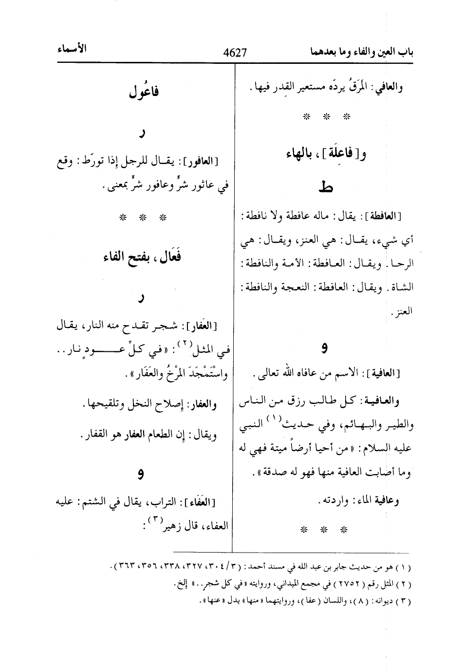 [العافور]: يقال للرجل إذا تورّط: وقع في عاثور شرٍّ وعافور شرٍّ بمعنى.