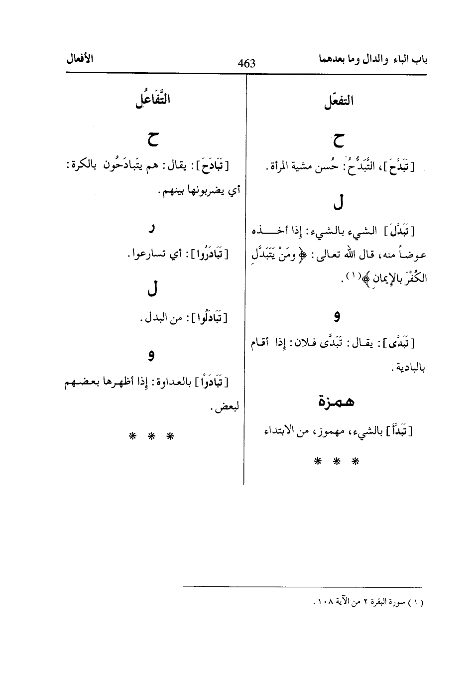 [تَبَدَّلَ] الشيء بالشيء: إِذا أخذه عوضاً منه، قال اللّاه تعالى: وَمَنْ يَتَبَدَّلِ الْكُفْرَ بِالْإِيماانِ «1».