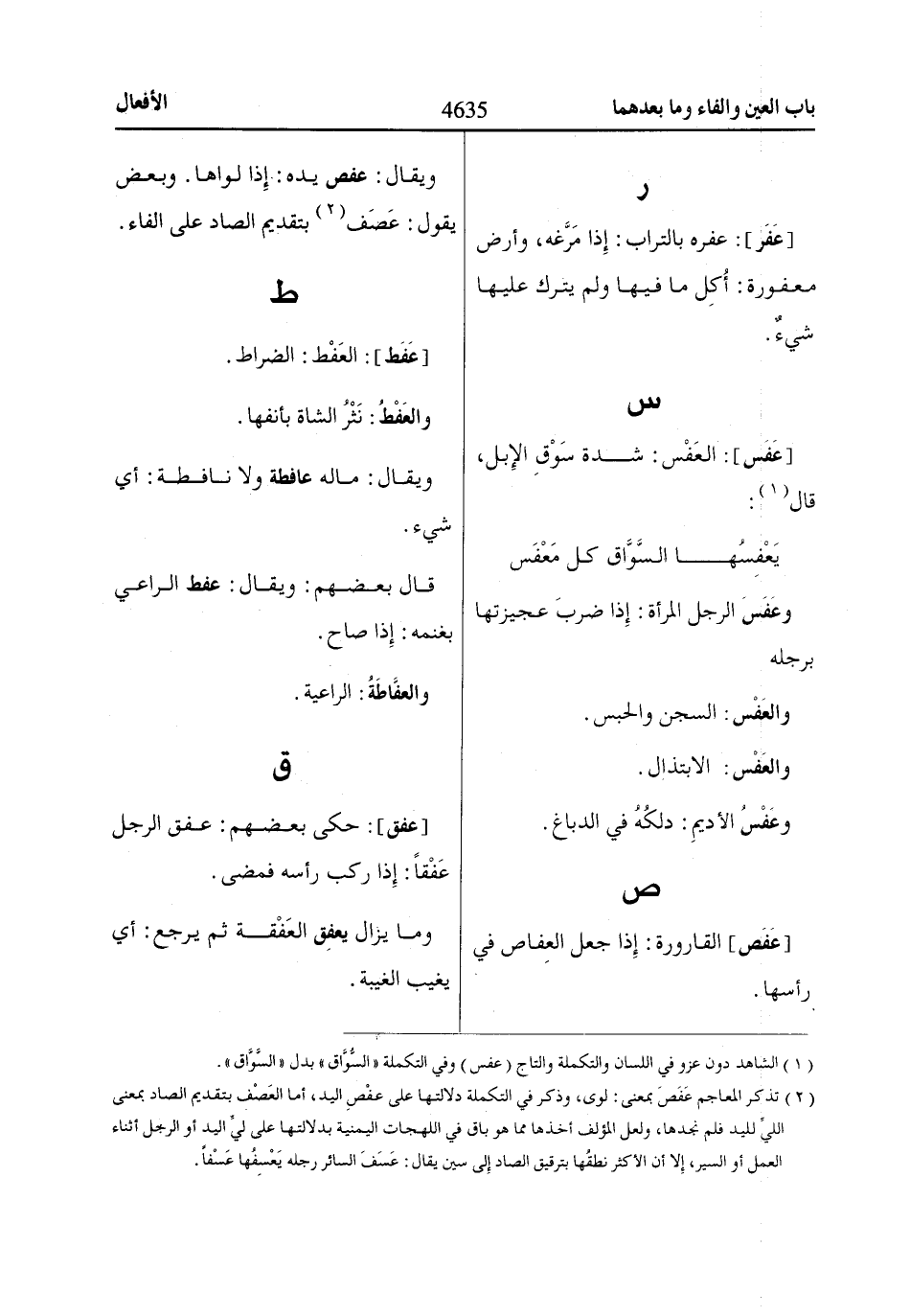 (2) تذكر المعاجم عَفَصَ بمعنى: لوى، وذكر في التكملة دلالتها على عفْصِ اليد، أما العَصْفِ بتقديم الصاد بمعنى اللي لليد فلم نجدها، ولعل المؤلف أخذها مما هو باق في اللهجات اليمنية بدلالتها على ليِّ اليد أو الرجل أثناء العمل أو السير، إلا أن الأكثر نطقُها بترقيق الصاد إلى سين يقال: عَسَفَ السائر رجله يَعْسِفُها عَسْفاً.
