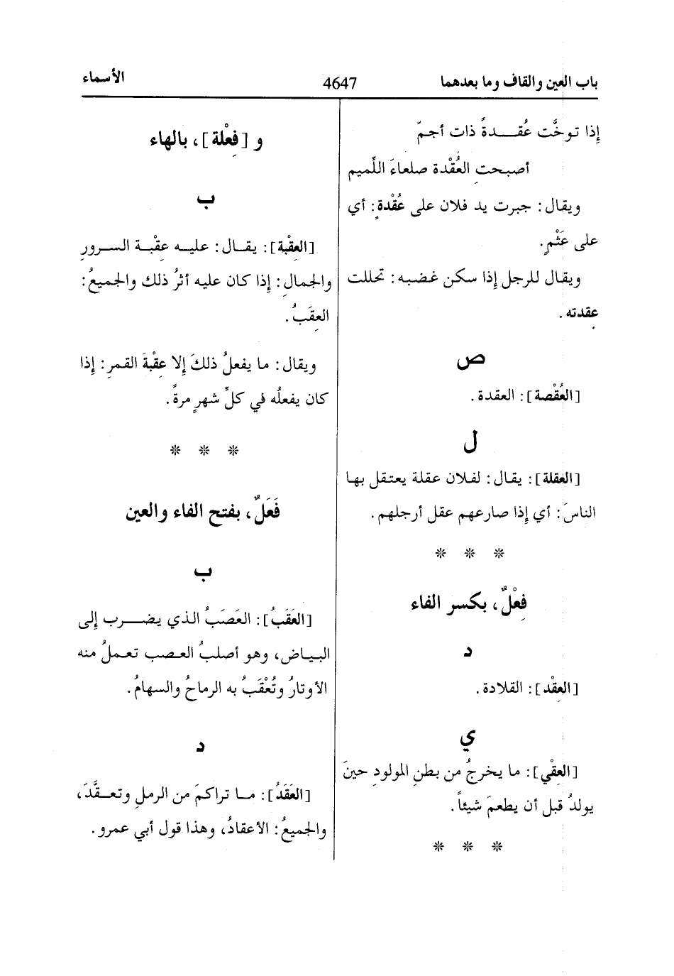 [العقلة]: يقال: لفلان عقلة يعتقل بها الناسَ: أي إذا صارعهم عقل أرجلهم.