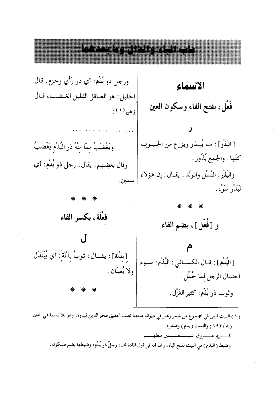 وضبط (البذم) في البيت بفتح الباء، رغم أنه في أول المادة قال: رجلٌ ذو بُذْم، وضبطها بضم فسكون.