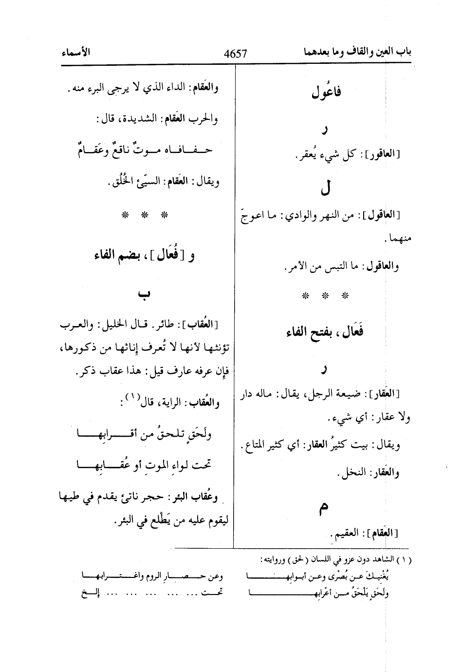 [العُقاب]: طائر. قال الخليل: والعرب تؤنثها لأنها لا تُعرف إناثها من ذكورها، فإن عرفه عارف قيل: هذا عقاب ذكر.