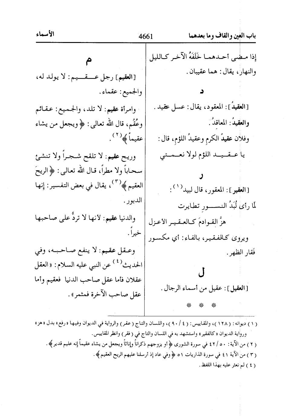 وامرأة عقيم: لا تلد، والجميع: عقائم وعُقُم، قال الله تعالى: وَيَجْعَلُ مَنْ يَشااءُ عَقِيماً «2».