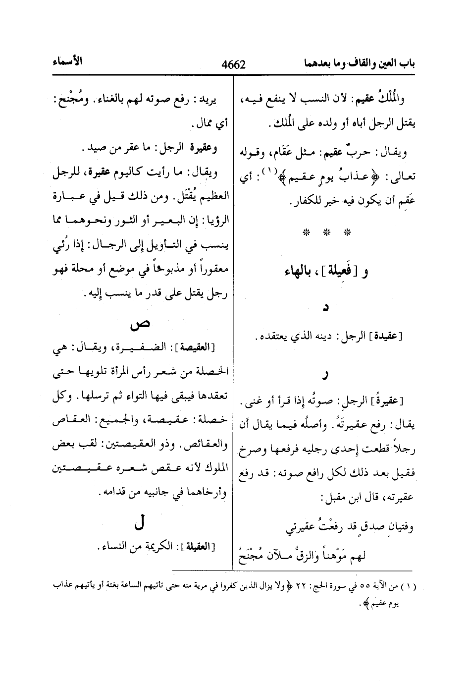 ويقال: حربٌ عقيم: مثل عَقَام، وقوله تعالى: عَذاابُ يَوْمٍ عَقِيمٍ «1»: أي عَقِم أن يكون فيه خير للكفار.