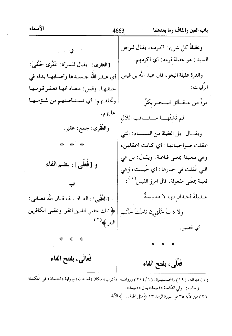 ويقال: بل العقيلة من النساء: التي عقلت صواحباتها: أي كانت أعقلهن، وهي فعلية بمعنى فاعلة. ويقال: بل هي التي عُقلت في خِدرها: أي حُبست، وهي فعيلة بمعنى مفعولة، قال امرؤ القيس «1»: