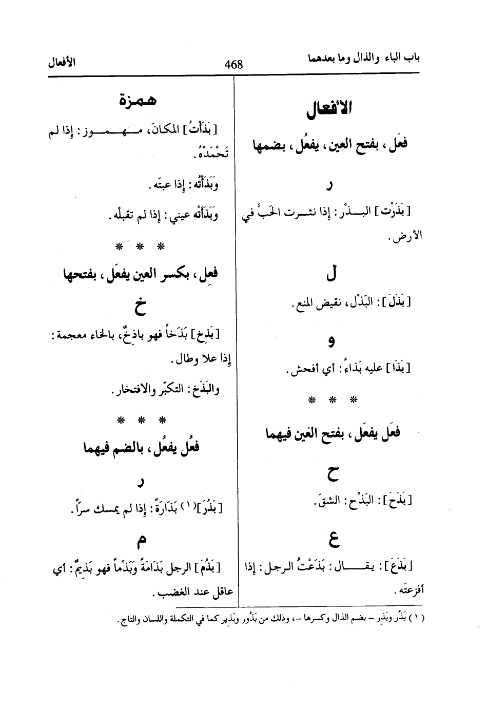 (1) بَذُر وبَذِر- بضم الذال وكسرها-، وذلك من بَذُور وبَذِير كما في التكملة واللسان والتاج.