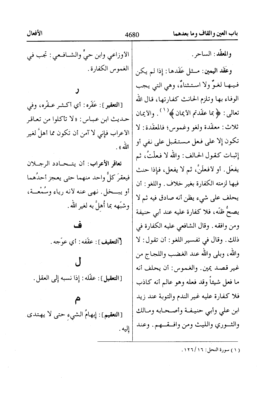 وعَقَد اليمين: مثل عَقَدها: إذا لم يكن فيها لغوٌ ولا استثناءٌ، وهي التي يجب الوفاء بها وتلزم الحانث كفارتها، قال الله تعالى: بِماا عَقَّدْتُمُ الْأَيْماانَ «1». والأيمان ثلاث: معقّدة ولغو وغموس؛ فالمعقّدة: لا تكون إلا على فعل مستقبل على نفي أو إثبات كقول الحالف: والله لا فعلْتُ، ثم يفعَل. أو لأفعلَنَّ، ثم لا يفعل، فإذا حنث فيها لزمته الكفارة بغير خلاف. واللغو: أن يحلف على شيء يظن أنه صادق فيه ثم لا يصحُّ ظنّه، فلا كفارة عليه عند أبي حنيفة ومن وافقه. وقال الشافعي عليه الكفارة في ذلك. وقال في تفسير اللغو: أن تقول: لا والله، وبلى والله عند الغضب واللجاج من غير قصد يمين. والغموس: أن يحلف أنه ما فعل شيئاً وقد فعله وهو عالم أنه كاذب فلا كفارة عليه غير الندم والتوبة عند زيد ابن علي وأبي حنيفة وأصحابه ومالك والثوري والليث ومن وافقهم. وعند الأوزاعي وابن حيٍّ والشافعي: تجب في الغموس الكفارة.