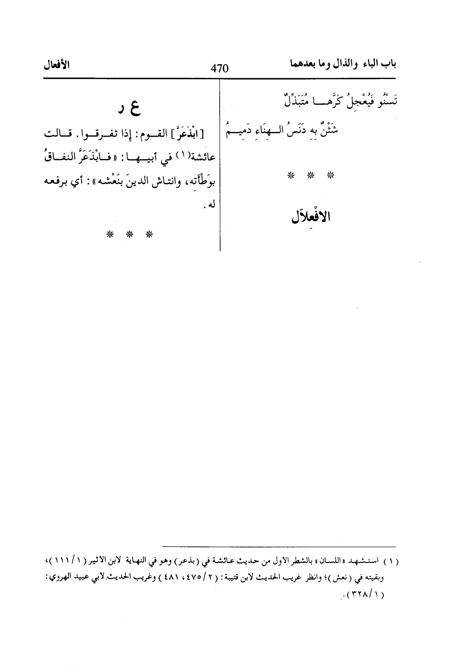 (1) استشهد «اللسان» بالشطر الأول من حديث عائشة في (بذعر) وهو في النهاية لابن الأثير (1/ 111)، وبقيته في (نعش)؛ وانظر غريب الحديث لابن قتيبة: (2/ 475، 481) وغريب الحديث لأبي عبيد الهروي: