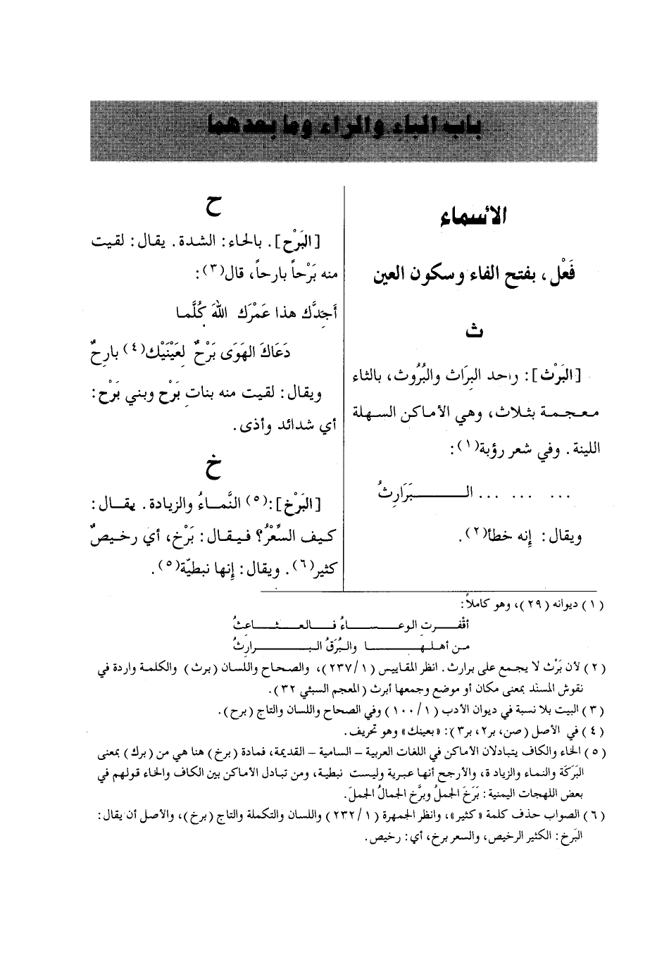 (2) لأن بَرْث لا يجمع على برارث. انظر المقاييس (1/ 237)، والصحاح واللسان (برث) والكلمة واردة في نقوش المسند بمعنى مكان أو موضع وجمعها أبرث (المعجم السبئي 32).