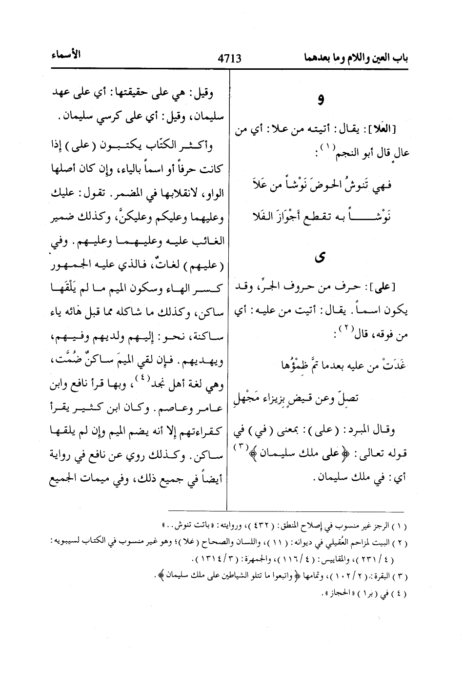 [على]: حرف من حروف الجرِّ، وقد يكون اسماً. يقال: أتيت من عليه: أي من فوقه، قال «2»: