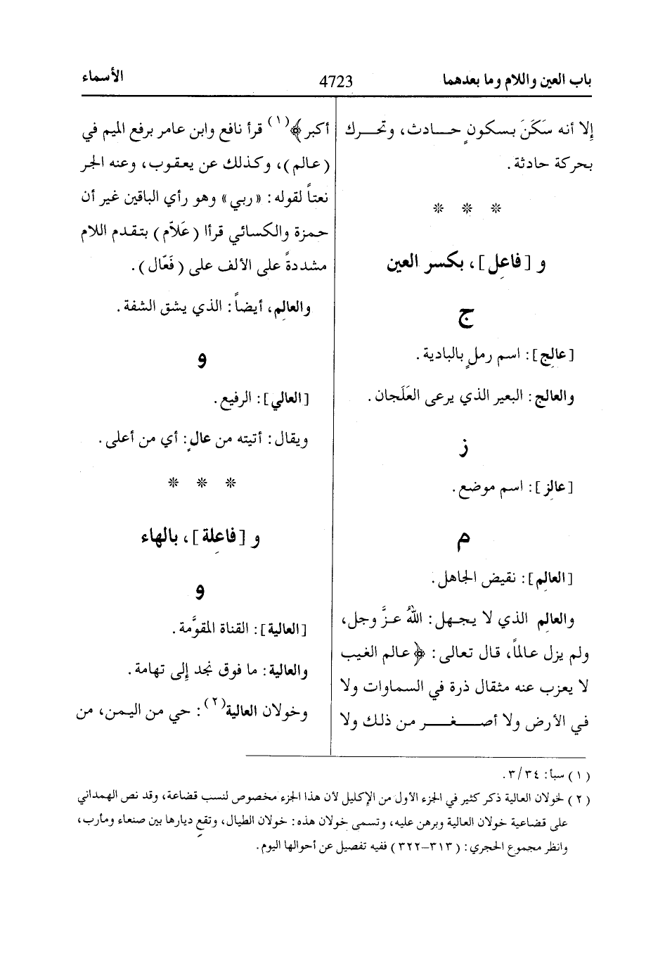والعالِم الذي لا يجهل: اللهُ عزَّ وجل، ولم يزل عالماً، قال تعالى: عاالِمِ الْغَيْبِ لاا يَعْزُبُ عَنْهُ مِثْقاالُ ذَرَّةٍ فِي السَّمااوااتِ وَلاا فِي الْأَرْضِ وَلاا أَصْغَرُ مِنْ ذالِكَ وَلاا أَكْبَرُ «1» قرأ نافع وابن عامر برفع الميم في (عالم)، وكذلك عن يعقوب، وعنه الجر نعتاً لقوله: «رَبِّي» وهو رأي الباقين غير أن حمزة والكسائي قرأا (عَلّام) بتقدم اللام مشددةً على الألف على (فَعّال).