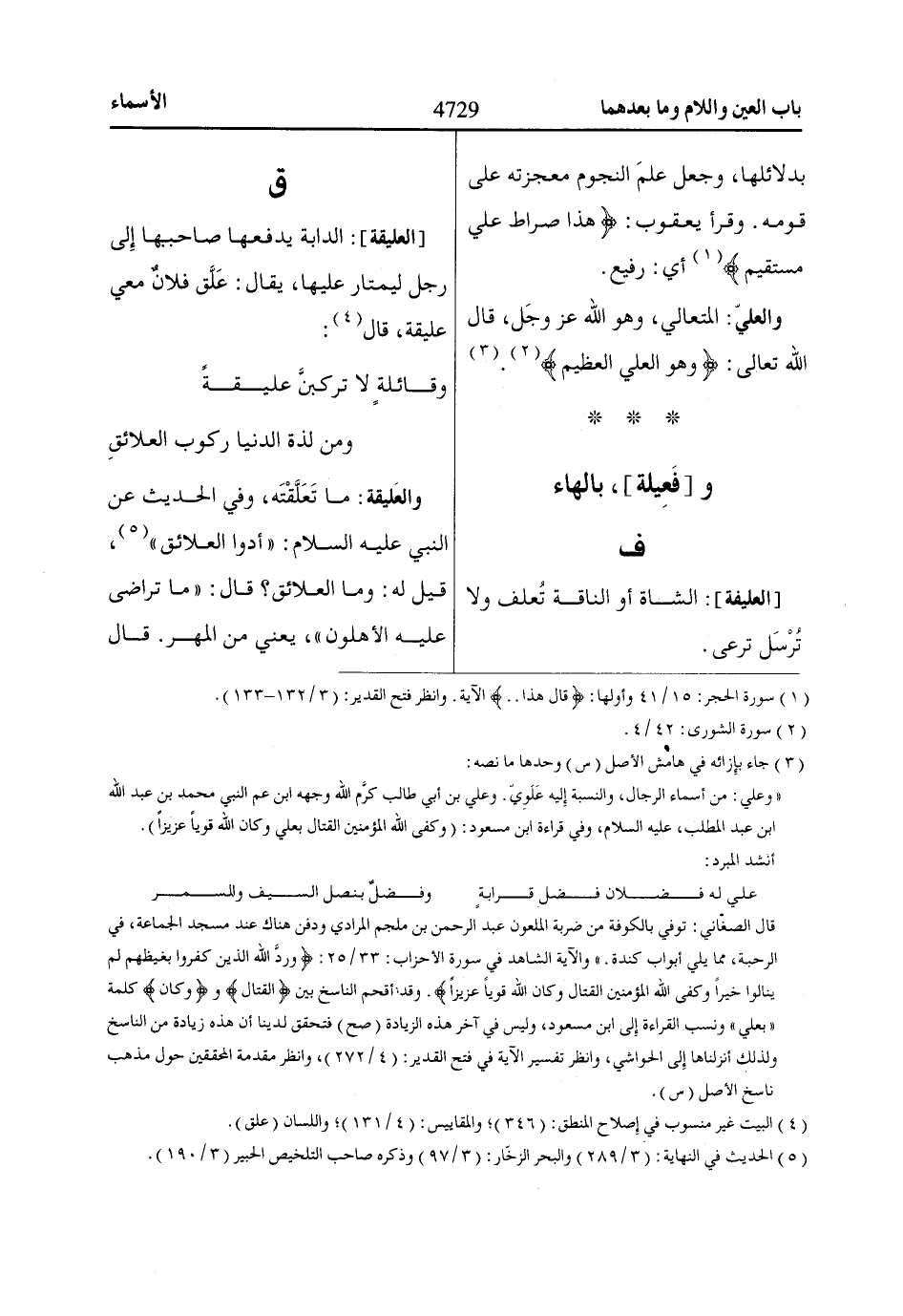 «وعلي: من أسماء الرجال، والنسبة إليه عَلوِيّ. وعلي بن أبي طالب كرَّم الله وجهه ابن عم النبي محمد بن عبد الله ابن عبد المطلب، عليه السلام، وفي قراءة ابن مسعود: (وكفى الله المؤمنين القتال بعلي وكان الله قوياً عزيزاً).