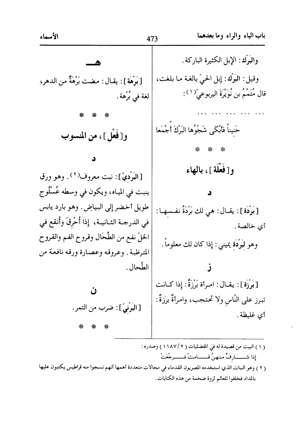 [البَرْدِيّ]: نبت معروف «2». وهو ورق ينبت في المياه، ويكون في وسطه عُسْلُوج طويل أخضر إِلى البياض. وهو بارد يابس في الدرجة الثانية، إِذا أُحْرِقَ وأُنقع في الخلّ نفع من الطِّحَال وقروح الفم والقروح المترظبة. وعروقه وعصارة ورقه نافعة من الطِّحال.
