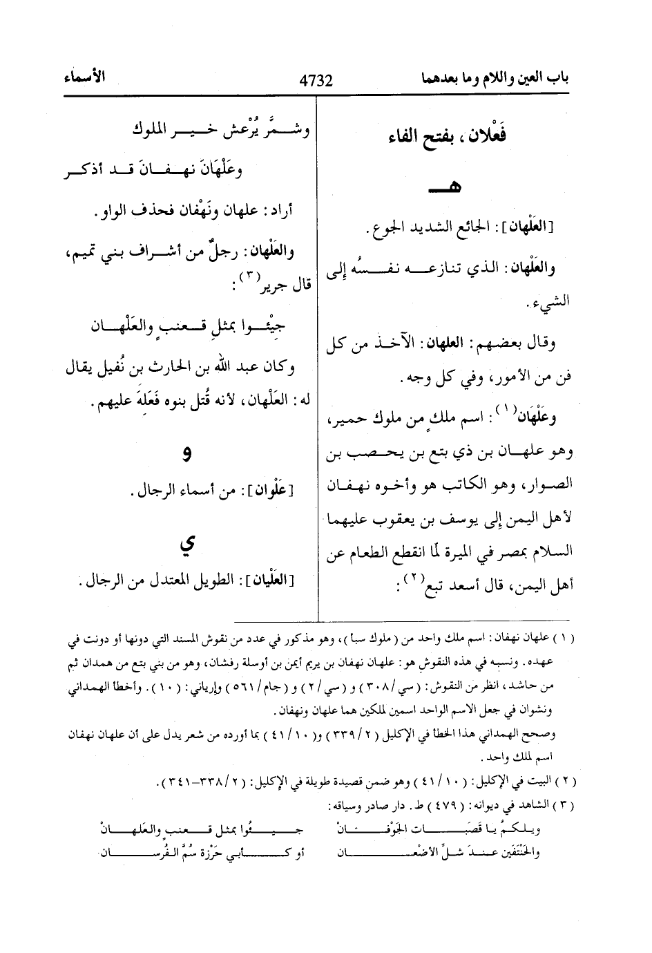 (1) علهان نهفان: اسم ملك واحد من (ملوك سبأ)، وهو مذكور في عدد من نقوش المسند التي دونها أو دونت في عهده. ونسبه في هذه النقوش هو: علهان نهفان بن يريم أيمن بن أوسلة رفشان، وهو من بني بتع من همدان ثم من حاشد، انظر من النقوش: (سي/ 308) و (سي/ 2) و (جام/ 561) وإرياني: (10). وأخطأ الهمداني ونشوان في جعل الاسم الواحد اسمين لملكين هما علهان ونهفان.