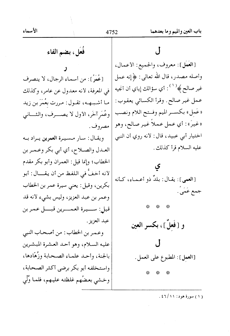 [العَمَل]: معروف، والجميع: الأعمال، وأصله مصدر، قال الله تعالى: إِنَّهُ عَمَلٌ غَيْرُ صاالِحٍ «1»: أي سؤالك إياي أن أنجيه عمل غير صالح. وقرأ الكسائي يعقوب: