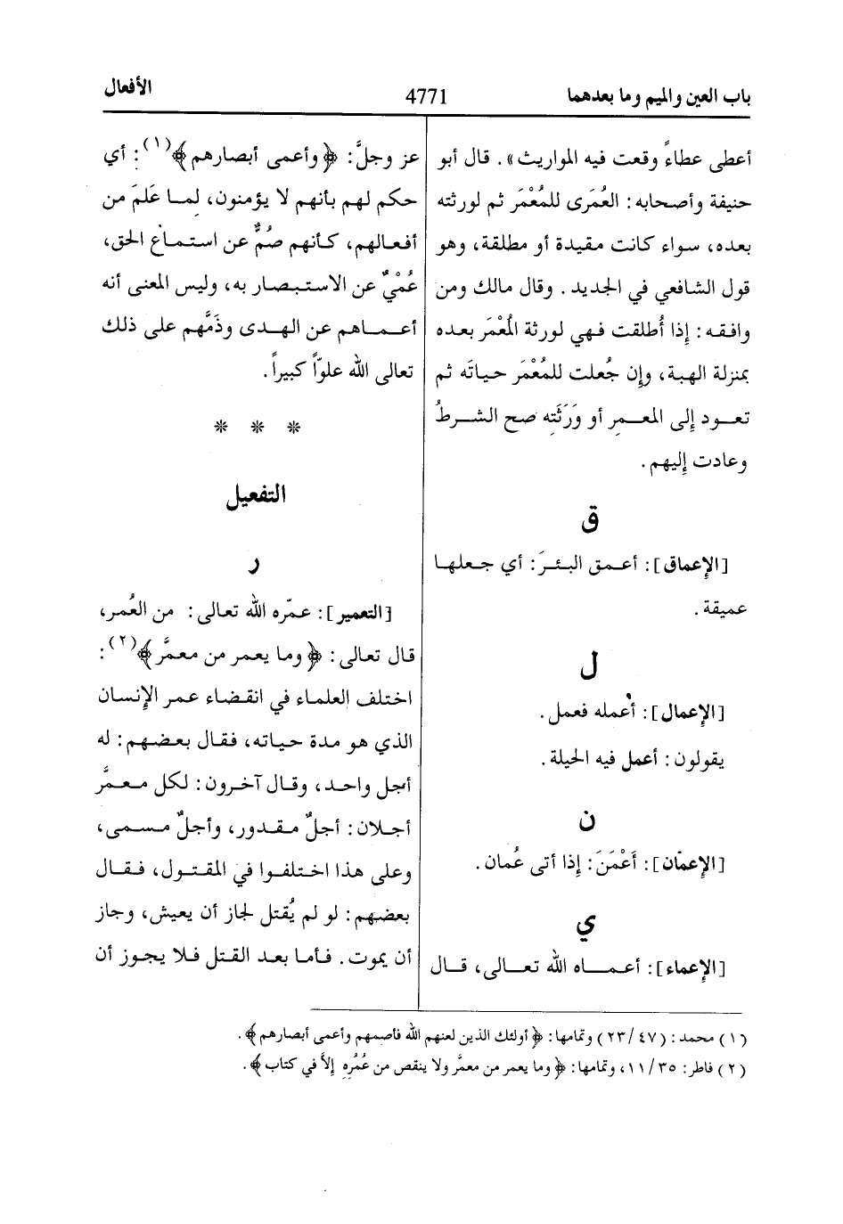 [الإعماء]: أعماه الله تعالى، قال عز وجلَّ: وَأَعْمى أَبْصاارَهُمْ «1»: أي حكم لهم بأنهم لا يؤمنون، لِما عَلمَ من أفعالهم، كأنهم صُمٌّ عن استماع الحق، عُمْيٌ عن الاستبصار به، وليس المعنى أنه أعماهم عن الهدى وذَمَّهم على ذلك تعالى الله علوّاً كبيراً.