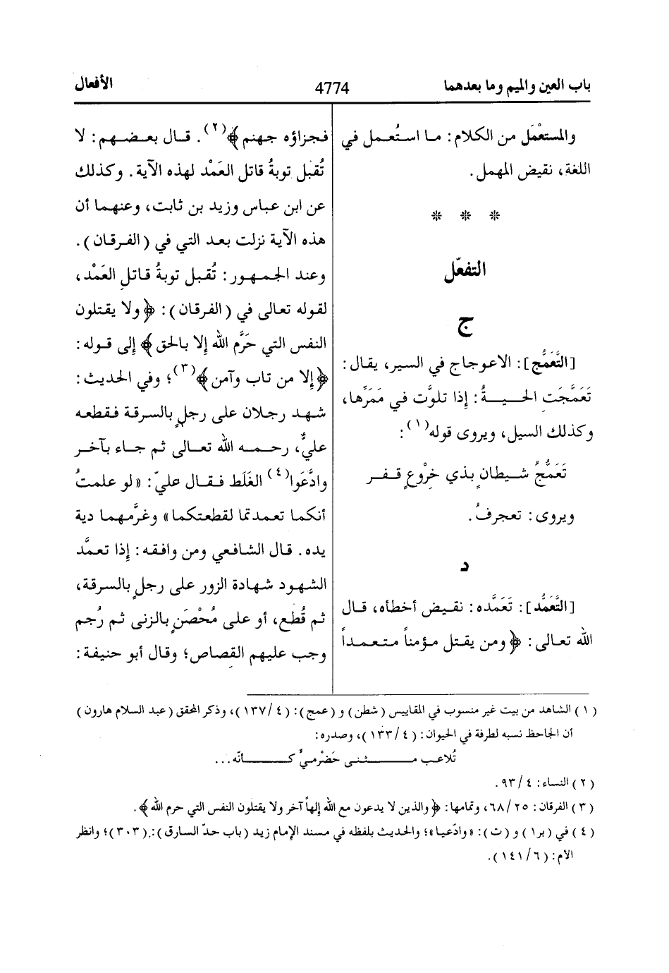 [التَّعَمُّد]: تَعَمَّده: نقيض أخطأه، قال الله تعالى: وَمَنْ يَقْتُلْ مُؤْمِناً مُتَعَمِّداً فَجَزااؤُهُ جَهَنَّمُ «2». قال بعضهم: لا تُقبل توبةُ قاتل العَمْد لهذه الآية. وكذلك عن ابن عباس وزيد بن ثابت،