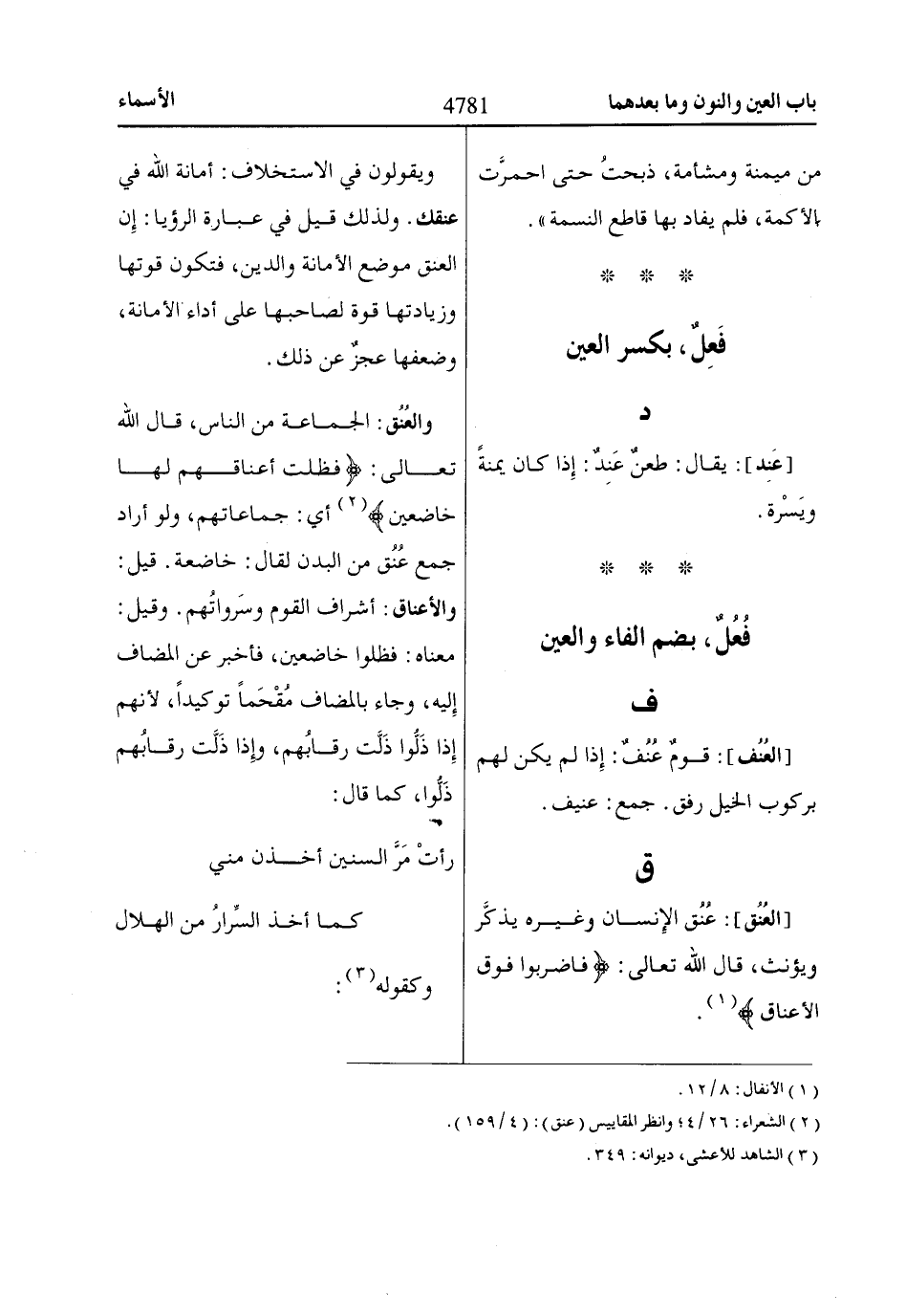 [العُنُق]: عُنُق الإنسان وغيره يذكَّر ويؤنث، قال الله تعالى: فَاضْرِبُوا فَوْقَ الْأَعْنااقِ «1».