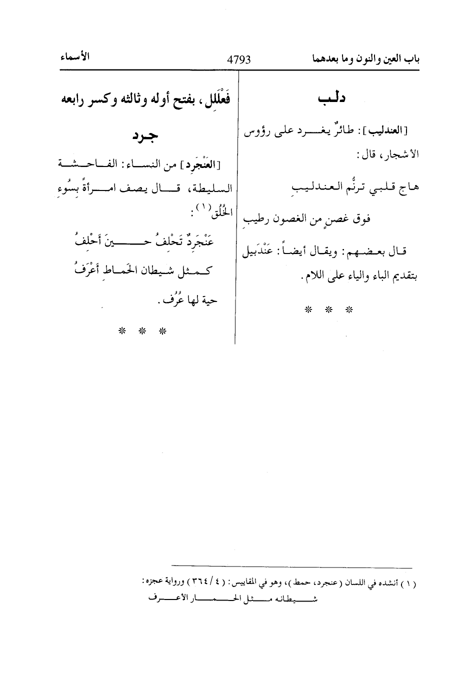 [العَنْجَرِد] من النساء: الفاحشة السليطة، قال يصف امرأةً بِسُوءِ الخُلُق «1»: