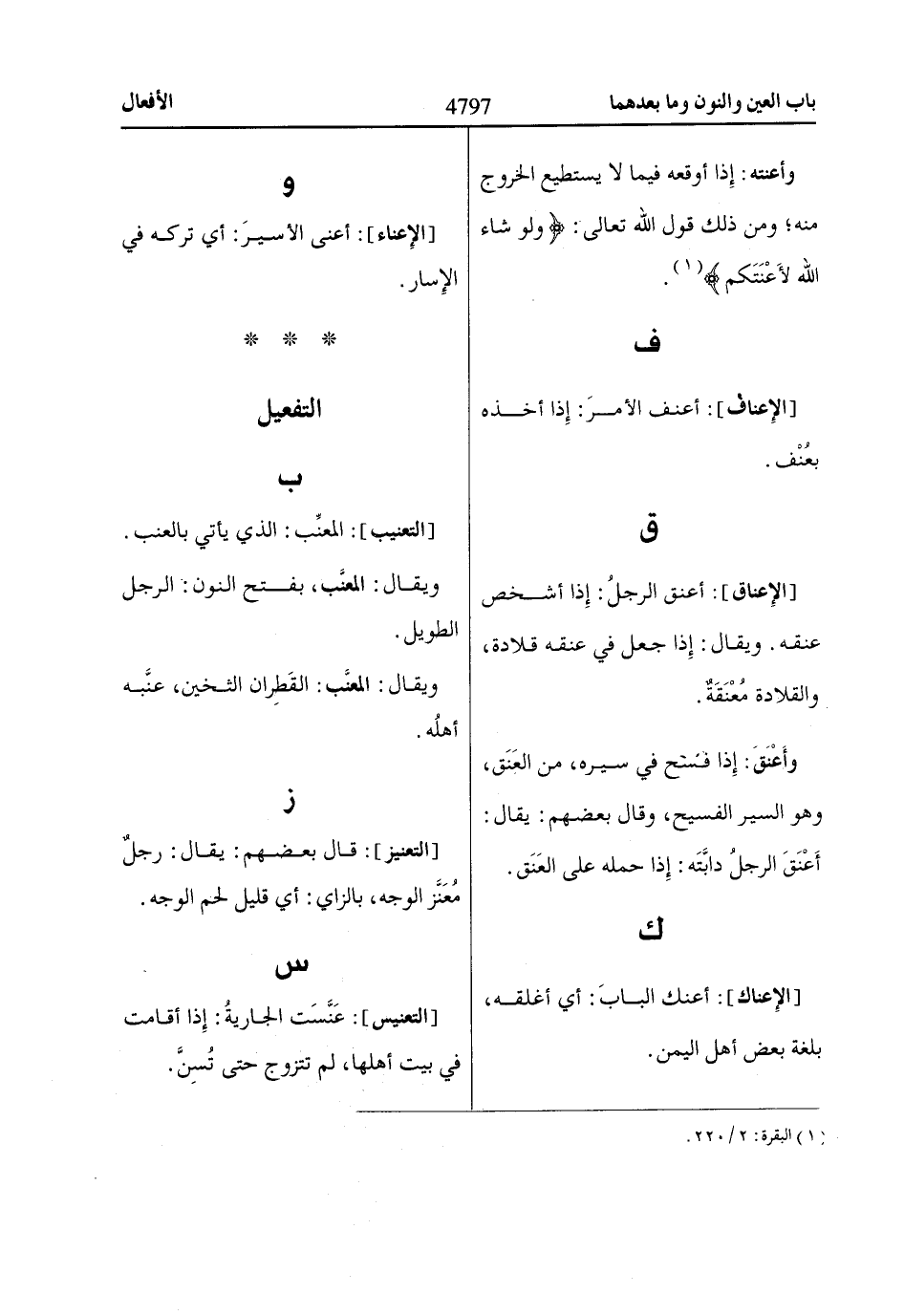 وأعنته: إذا أوقعه فيما لا يستطيع الخروج منه؛ ومن ذلك قول الله تعالى: وَلَوْ شااءَ اللّاهُ لَأَعْنَتَكُمْ «1».