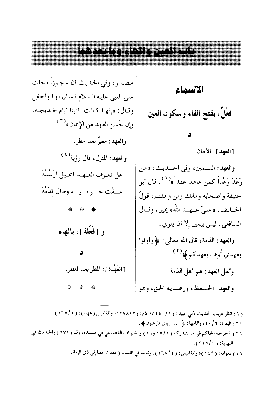 (1) انظر غريب الحديث لأبي عبيد: (1/ 440)؛ الأم: (2/ 278)؛ والمقاييس (عهد): (4/ 167).