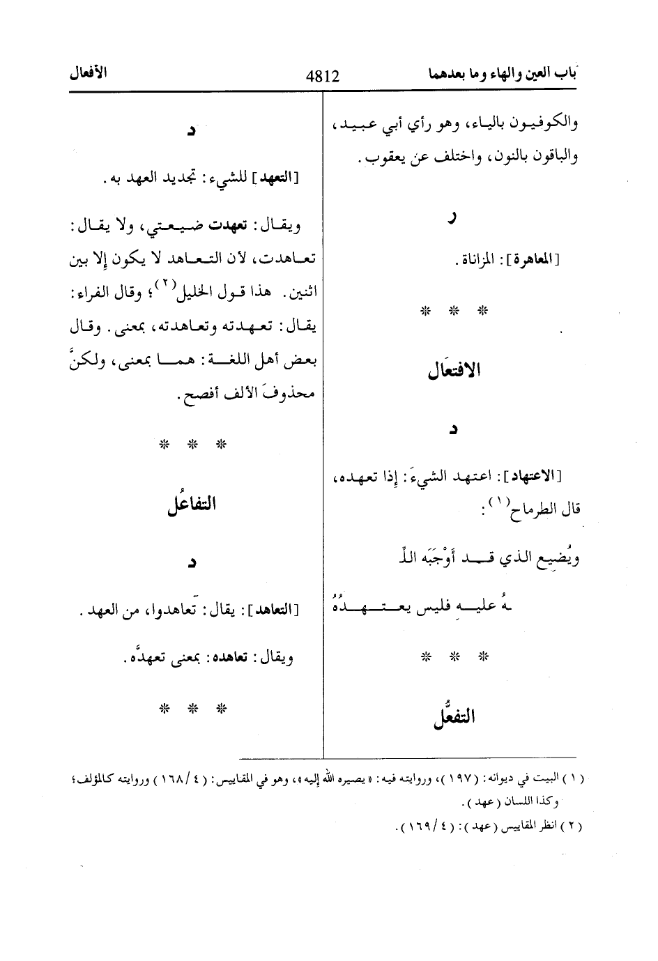 [الاعتهاد]: اعتهد الشيءَ: إذا تعهده، قال الطرماح «1»: