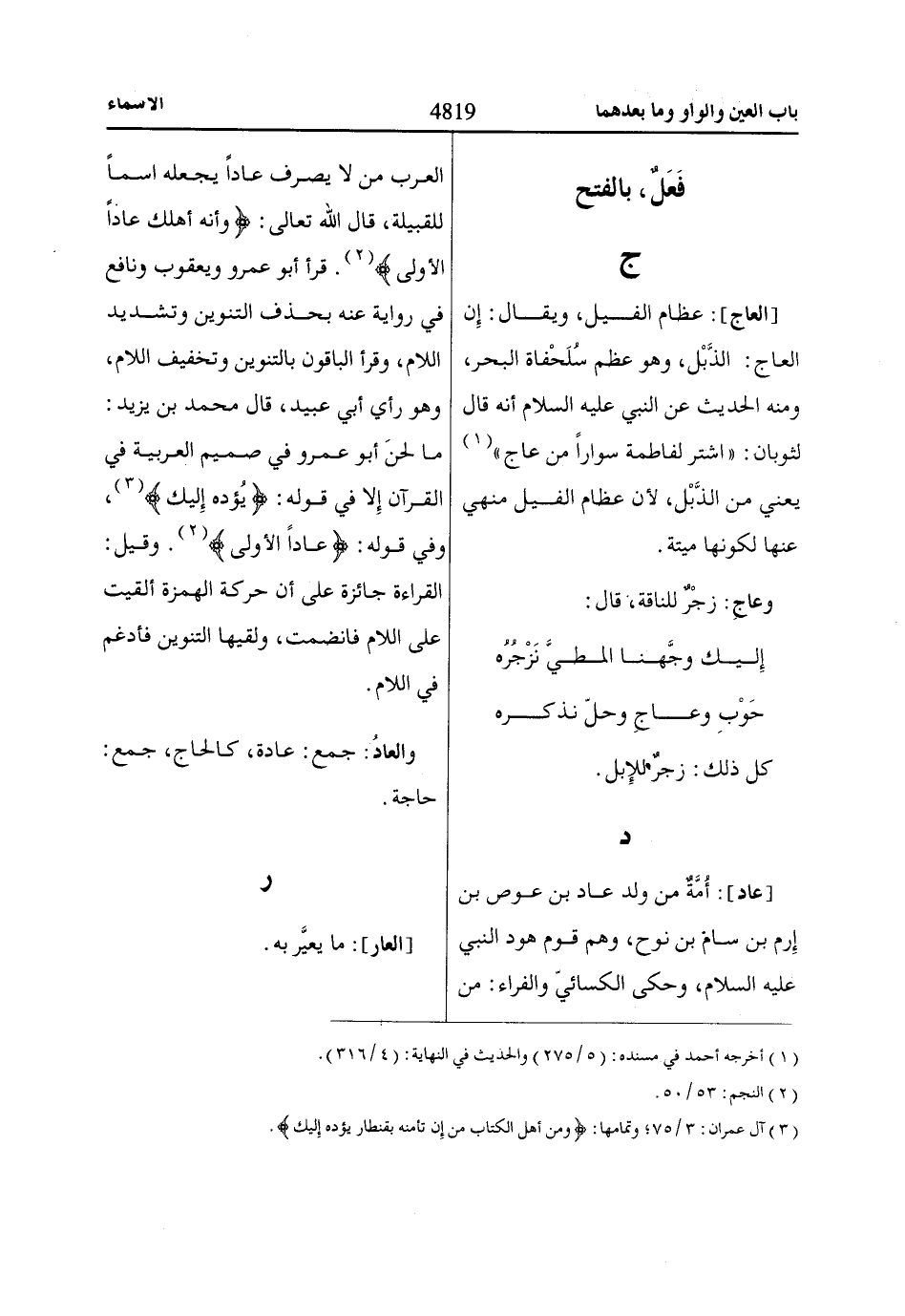 [عاد]: أُمَّةٌ من ولد عاد بن عوص بن إرم بن سام بن نوح، وهم قوم هود النبي عليه السلام، وحكى الكسائيّ والفراء: من العرب من لا يصرف عاداً يجعله اسماً للقبيلة، قال الله تعالى: وَأَنَّهُ أَهْلَكَ عااداً الْأُولى «2». قرأ أبو عمرو ويعقوب ونافع في رواية عنه بحذف التنوين وتشديد اللام، وقرأ الباقون بالتنوين وتخفيف اللام، وهو رأي أبي عبيد، قال محمد بن يزيد: