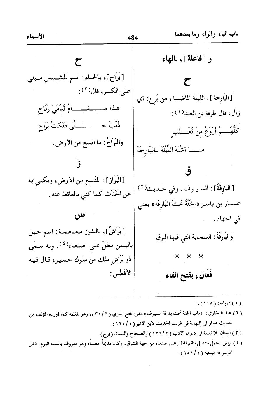 [البَارِحَة]: الليلة الماضية، من بَرِح: أي زال، قال طرفة بن العبد «1»: