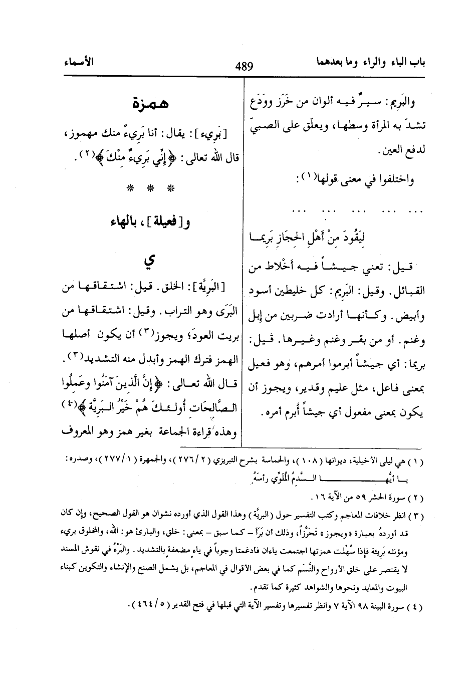 [بَرِيء]: يقال: أنا بَرِيءٌ منك مهموز، قال اللّاه تعالى: إِنِّي بَرِيءٌ مِنْكَ «2».