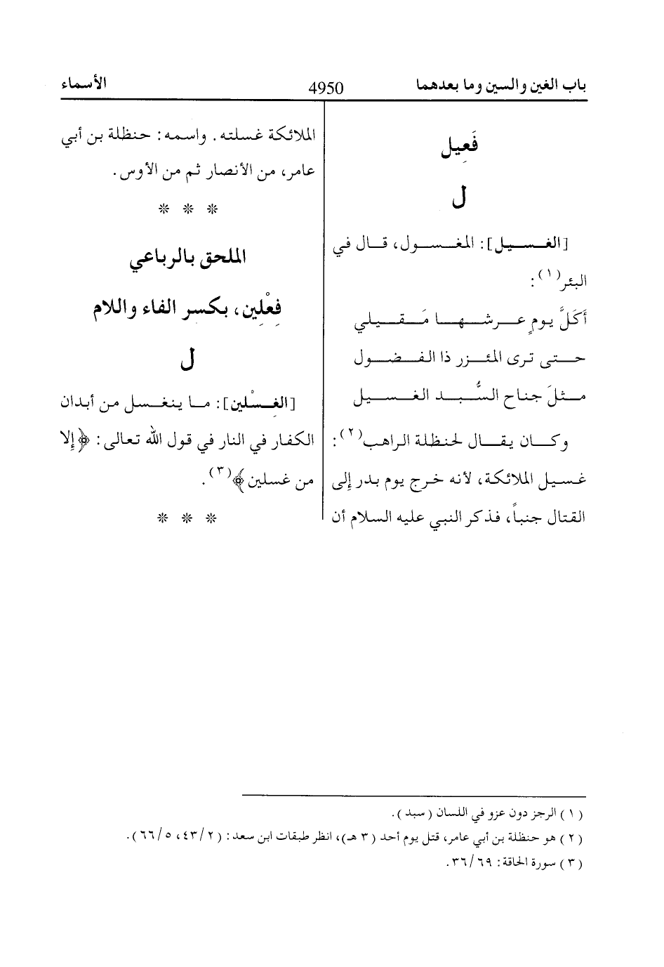 [الغِسْلين]: ما ينغسل من أبدان الكفار في النار في قول اللّاه تعالى: إِلّاا مِنْ غِسْلِينٍ «3».