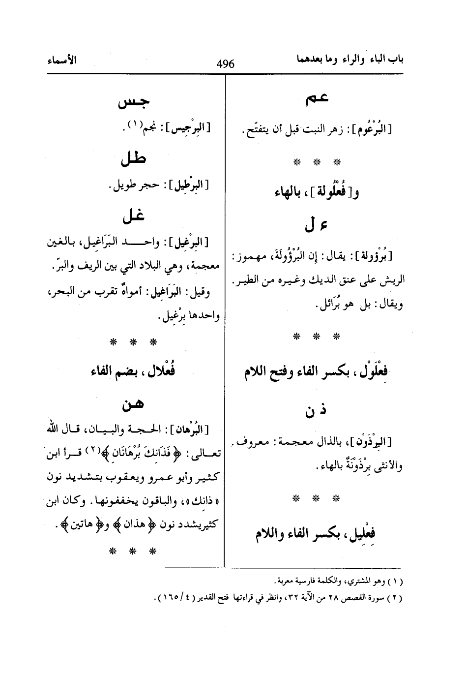 [البُرْهان]: الحجة والبيان، قال اللّاه تعالى: فَذاانِكَ بُرْهااناانِ «2» قرأ ابن كثير وأبو عمرو ويعقوب بتشديد نون «ذانِك»، والباقون يخففونها. وكان ابن كثير يشدد نون هاذاانِ* وهااتَيْنِ.