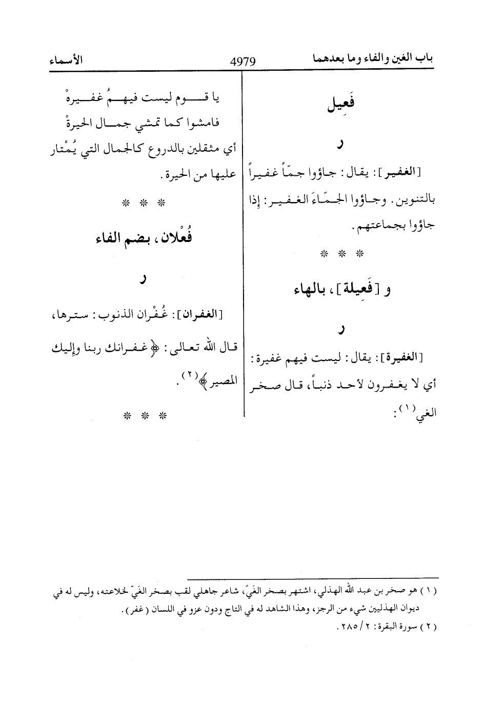 (1) هو صخر بن عبد اللّاه الهذلي، اشتهر بصخر الغيّ، شاعر جاهلي لقب بصخر الغيّ لخلاعته، وليس له في ديوان الهذليين شيء من الرجز، وهذا الشاهد له في التاج ودون عزو في اللسان (غفر).