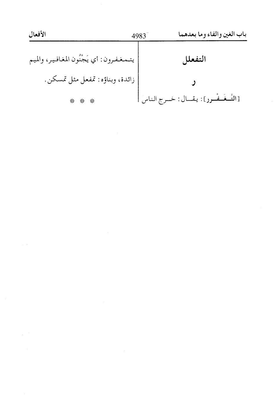 [التَّغَفْرر]: يقال: خرج الناس يتمغفرون: أي يَجْنُون المغافير، والميم زائدة، وبناؤه: تمفعل مثل تمسكن.
