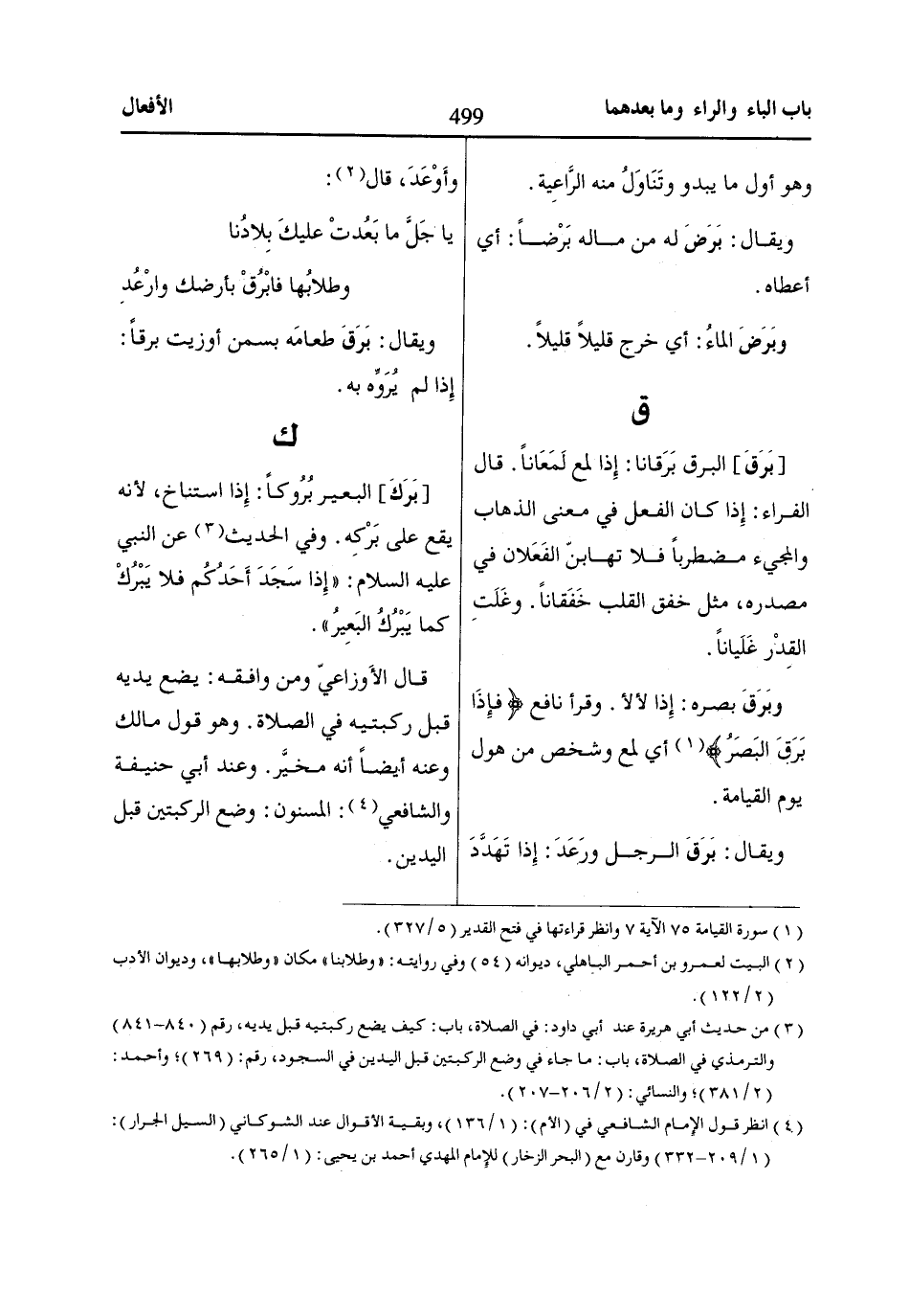 [بَرَقَ] البرق بَرَقانا: إِذا لمع لَمَعَاناً. قال الفراء: إِذا كان الفعل في معنى الذهاب والمجيء مضطرباً فلا تهابنّ الفَعَلان في مصدره، مثل خفق القلب خَفَقاناً. وغَلَتِ القِدْر غَلَياناً.